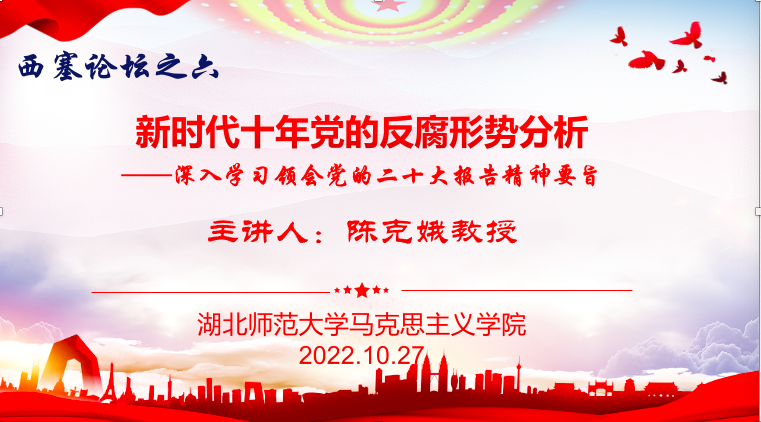 1027日下午,黑料不打烊 成功举办第六次“西塞论坛”。为将学术研究和学习宣传党的二十大精神有机结合,学院特邀长期从事党史党建研究的陈克娥教授在学院会议室做题为“新时代十年党的反腐形势分析”讲座,以此带领学院师生一起深入学习领会党的二十大报告精神要旨。讲座由学院副院长汪灿德主持,新增硕士生导师和全体研究生聆听了此次讲座。
