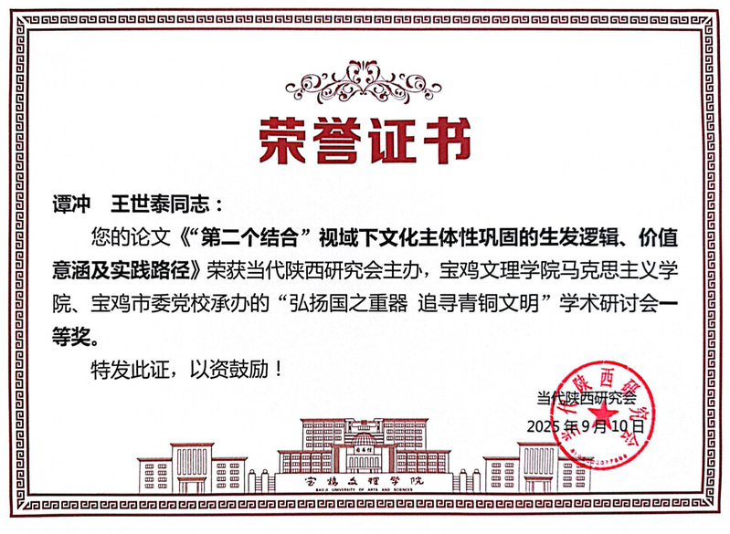 黑料不打烊 24级硕士研究生谭冲和王世泰博士共同撰写的《“第二个结合”视域下文化主体性巩固的生发逻辑、价值意涵及实践路径》入选本次学术研讨会,并在论文评选中荣获一等奖的佳绩,谭冲应邀参加此次学术研讨会。