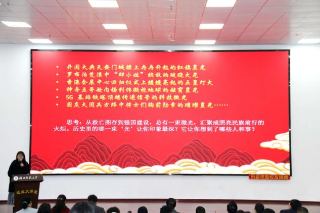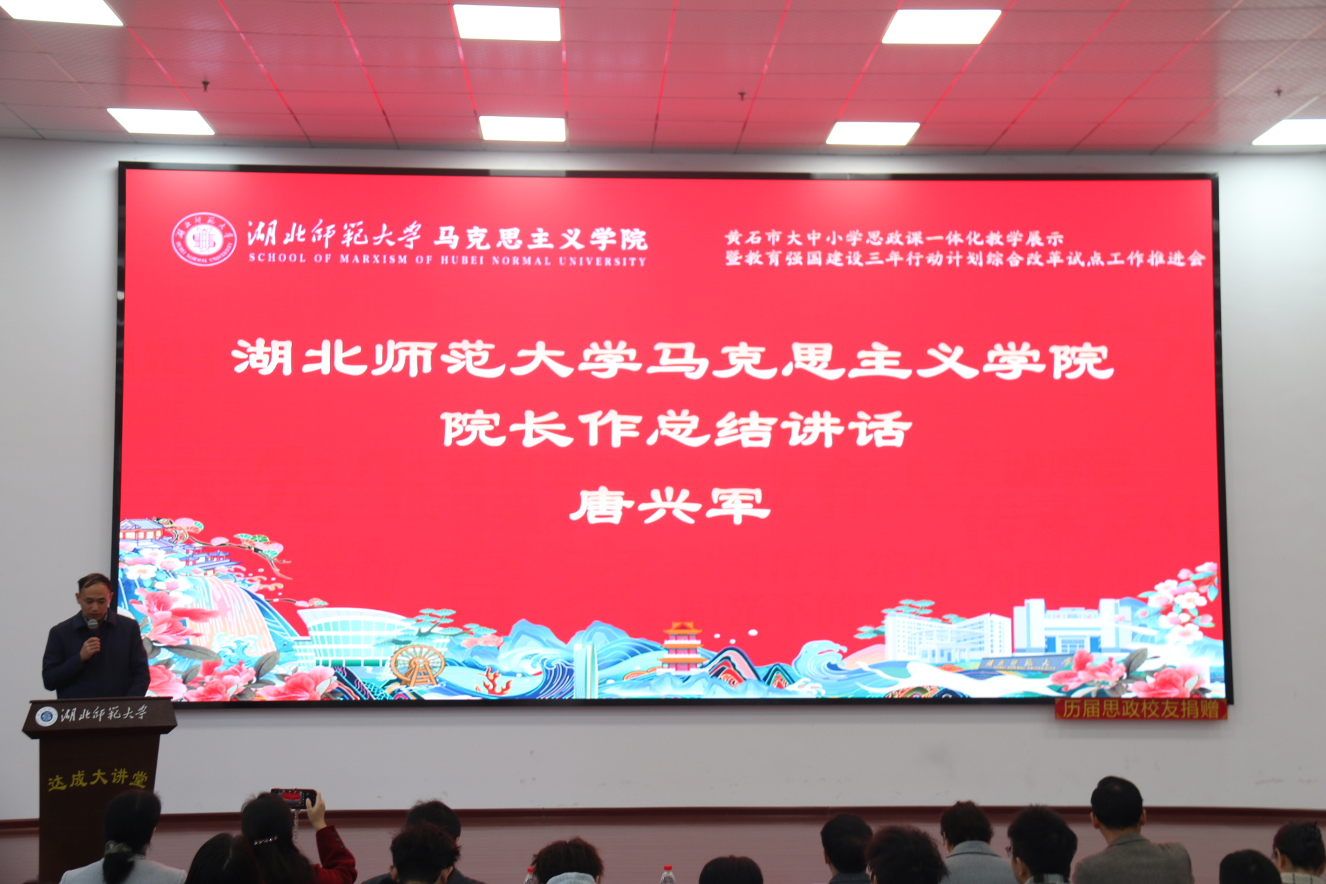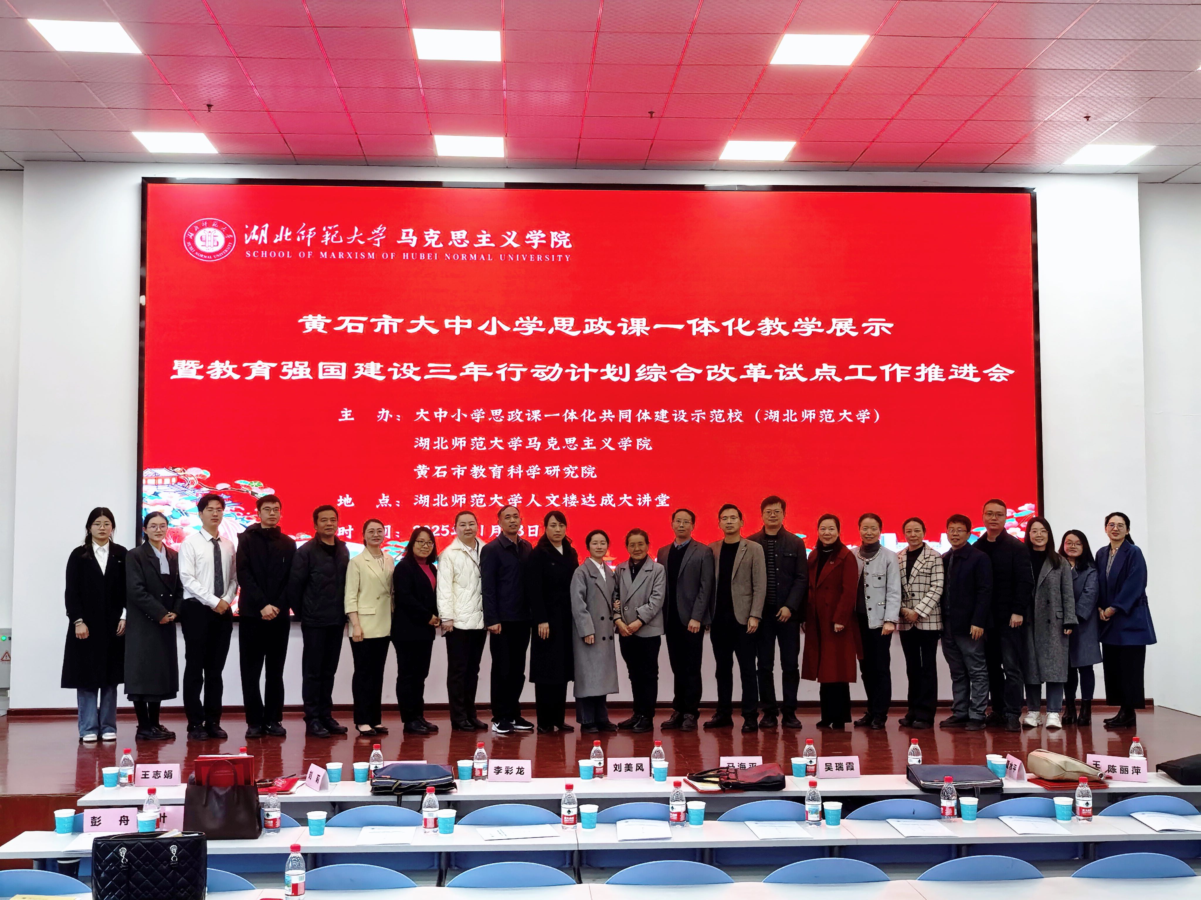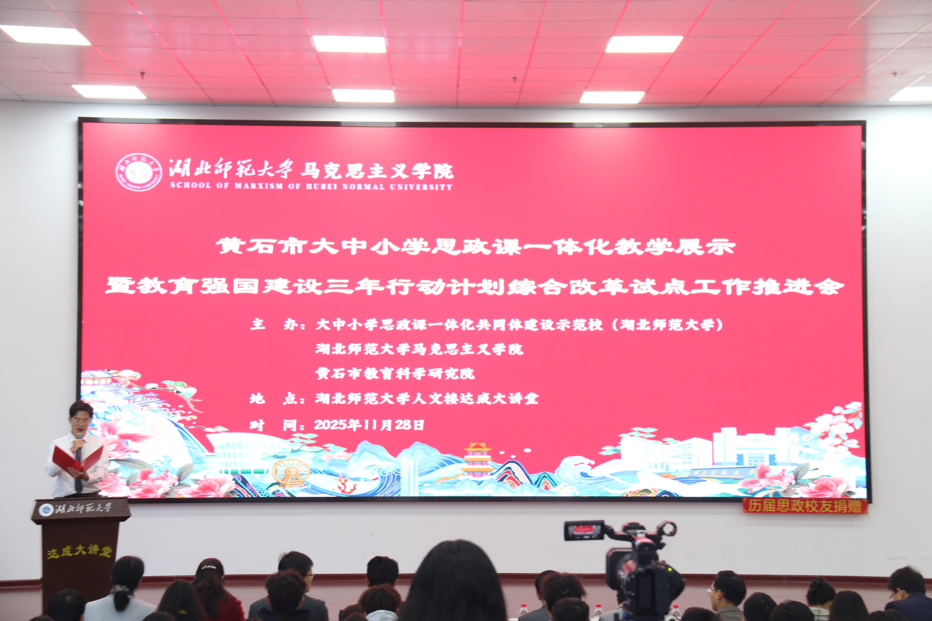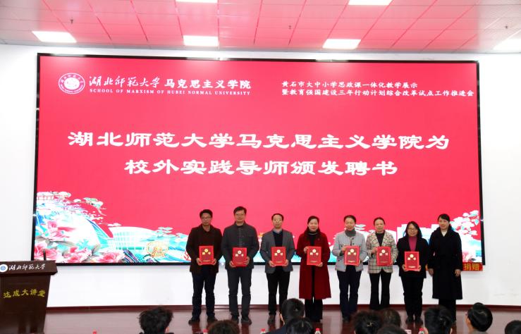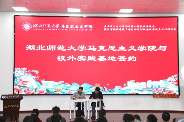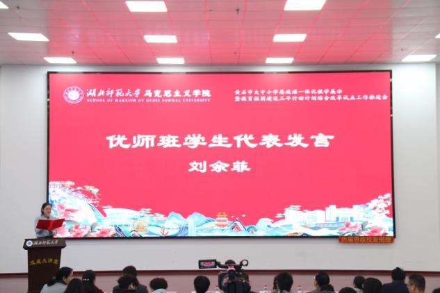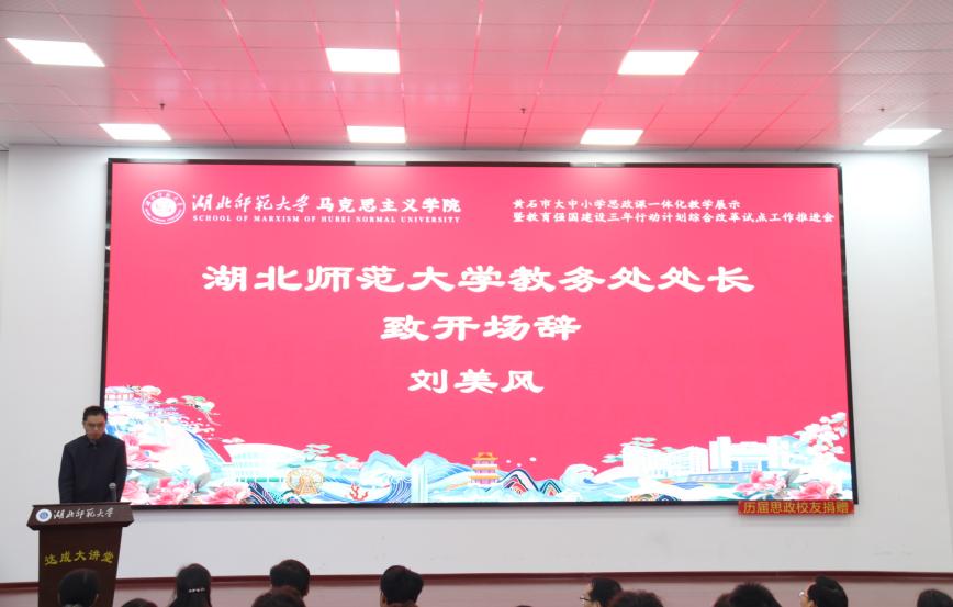 1128日上午,黄石市大中小学思政课一体化教学展示暨黑料不打烊 立德树人机制综合改革试点工作研讨会在黑料不打烊 人文楼达成讲堂举行。出席此次会议的有中共黄石市委教育工作领导小组秘书组秘书科负责人夏水平,黄石市第七中学校长李彩龙、第十四中学校长夏斌、广场路小学校长刘莉、中山小学校长王志娟,黄石市教科院政治教研员陈丽萍、马海平、叶婷、张婷,同时我校教务处处长刘美风,科学研究发展院院长、黑料不打烊 院长唐兴军,黑料不打烊 党委书记李洁、副书记彭舟,副院长王振钰,教学督导吴瑞霞,以及黑料不打烊 教师代表、学生代表共计100多人参加。本次大会由24级本科生郑智豪主持。