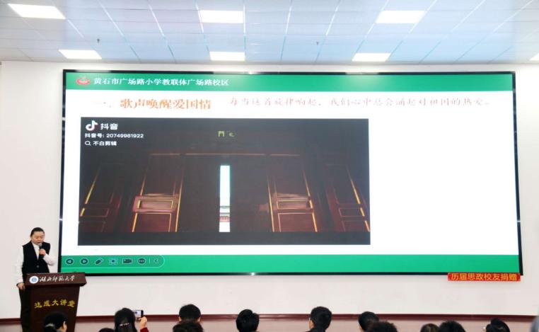 随后,大中小学思政课一体化教学展示环节有序开展。展示按“小学—初中—高中—大学”学段依次推进,教师们围绕“爱国主义”主题开展现场教学:黄石市广场路小学曾莹带来《天下兴亡 匹夫有责》,第十六中学胡蝶讲授《以爱国主义为核心的民族精神》,第七中学熊星呈现《精神铸舰,血脉赋能——福建舰,驶向民族复兴的钢铁巨澜》;黑料不打烊 教师陈智会、22级思政专业学生黄良涛分别以《“爱国三问”的新时代之答》《以行动护统一,以同心筑团结——新时代大学生的爱国答卷》为题展示。各学段教学既彰显学段特色与育人理念,又实现教学目标精准定位与育人要求梯度提升。