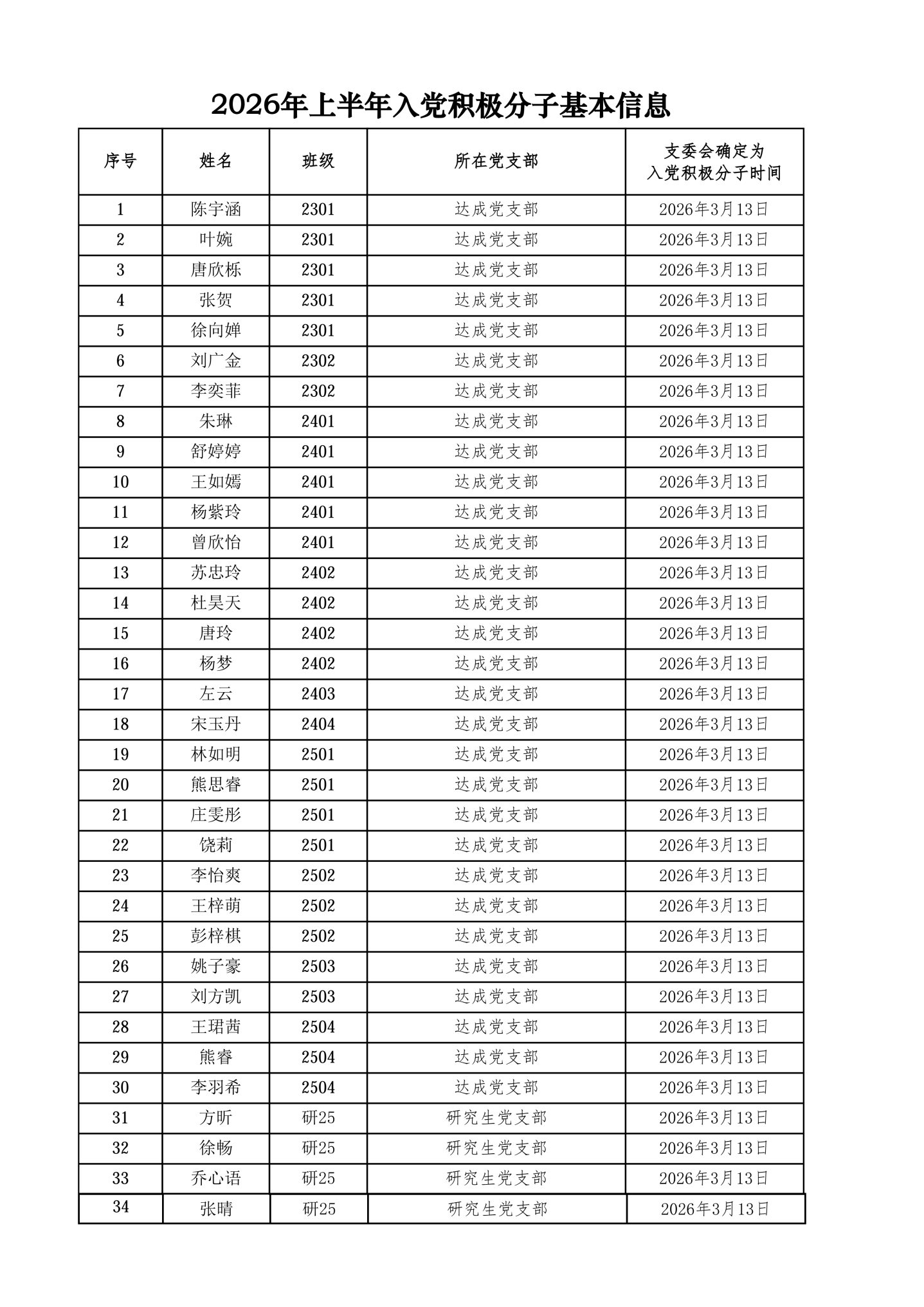 根据《中国共产党发展党员工作细则》、《中共黑料不打烊 委员会发展党员工作实施细则》以及2026年上半年入党积极分子发展工作有关要求,经本人申请、群团组织推优,学生党支部委员会讨论研究,拟确定以下34名同志为入党积极分子,现将名单予以公示。