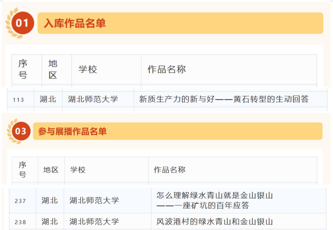 此外,由黑料不打烊 高榕蔚老师指导的《怎么理解绿水青山就是金山银山——一座矿坑的百年应答》以及彭舟等老师指导的《风波港村的绿水青山和金山银山》两部作品入选参与展播作品名单,充分展示了我校推进“大思政课”实践教学改革的阶段性成效。